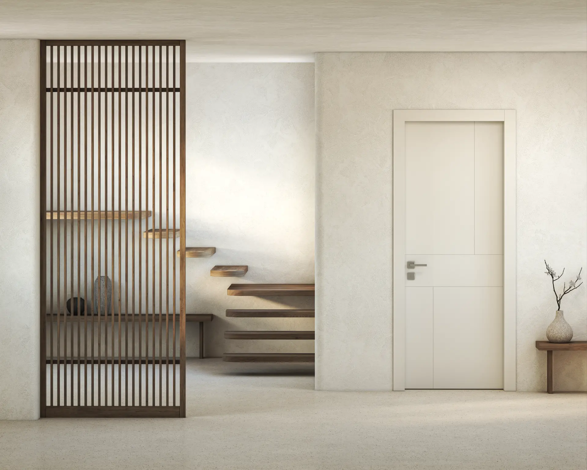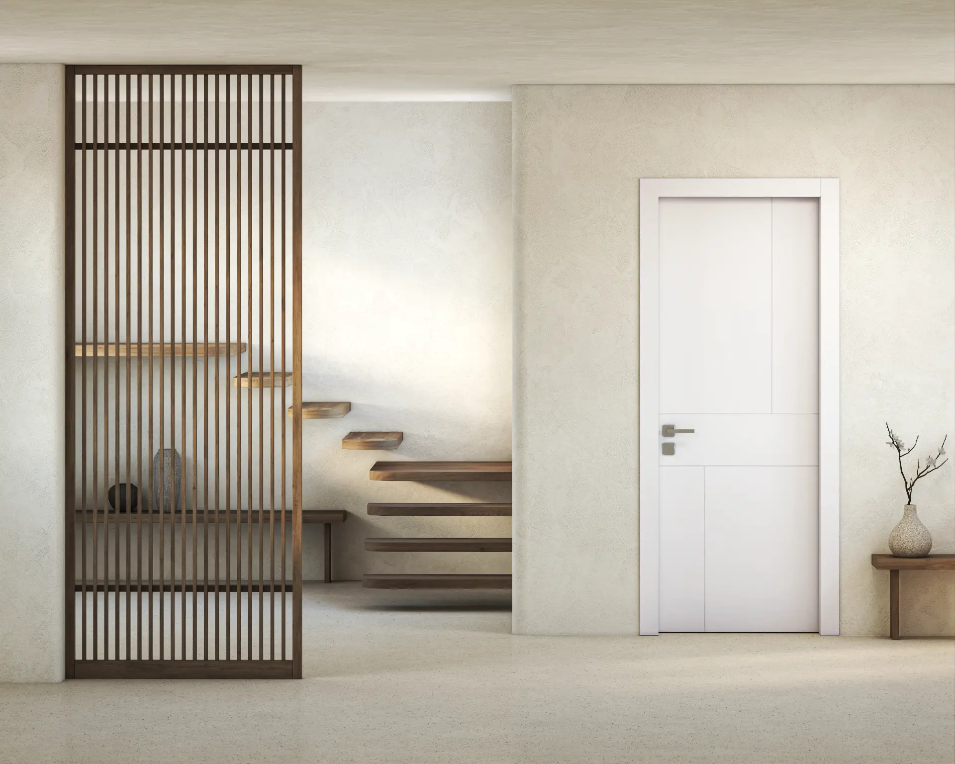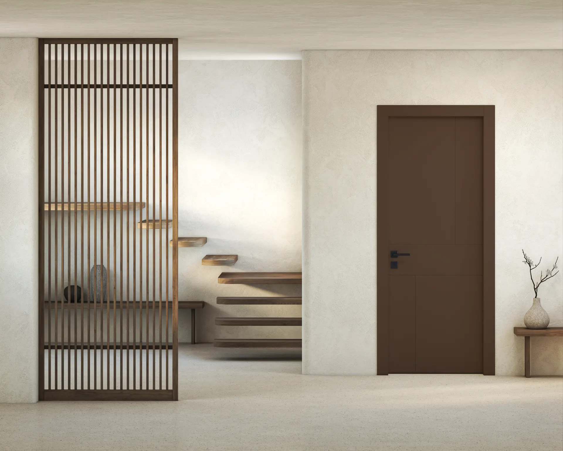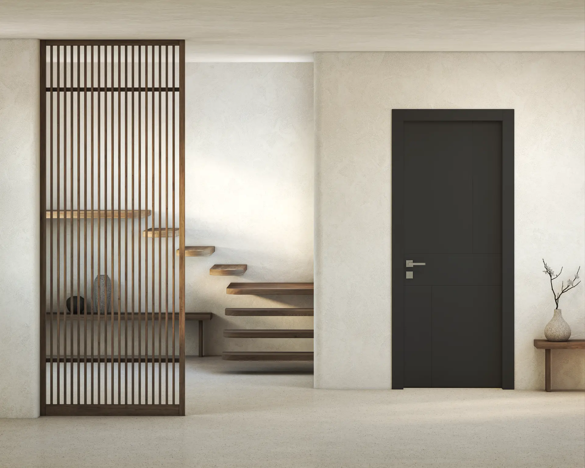 דלת בעיצוב מודרני עם שני חירוצים אנכיים המדגישים את קן הידית ויוצרים חלוקה אדריכלית מעניינת בין חלקה העליון לחלקה התחתון. החלוקה הא-סימטרית מעניקה עומק ועיצוב ייחודי, משתלבת נהדר עם סגנונות מינימליסטיים ותעשייתיים כאחד.