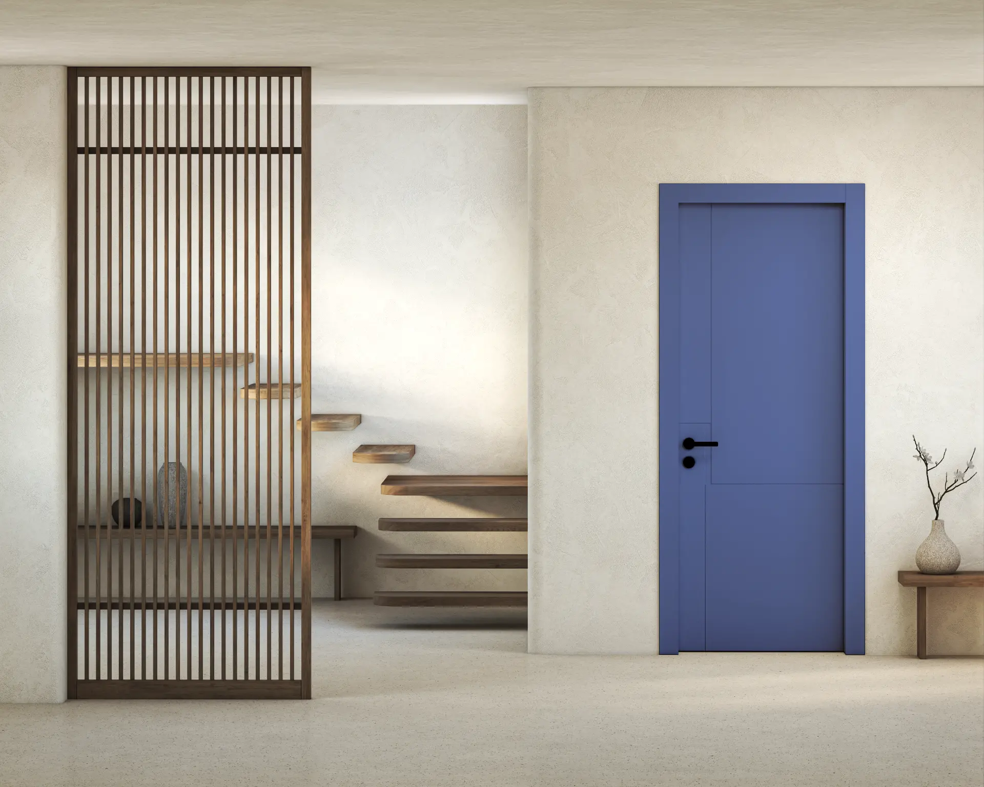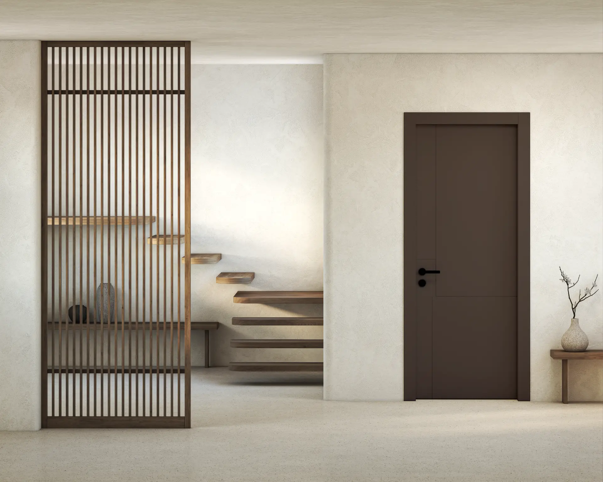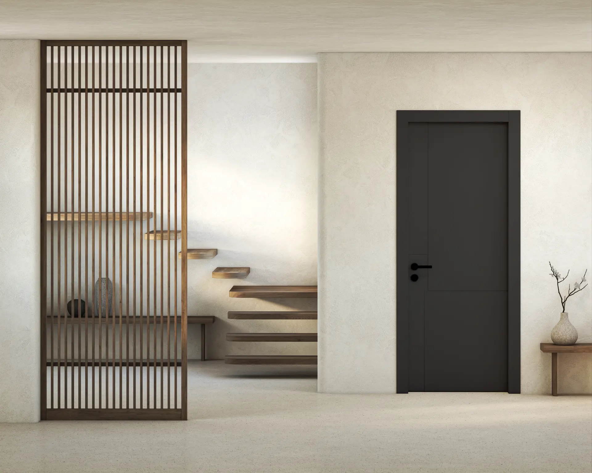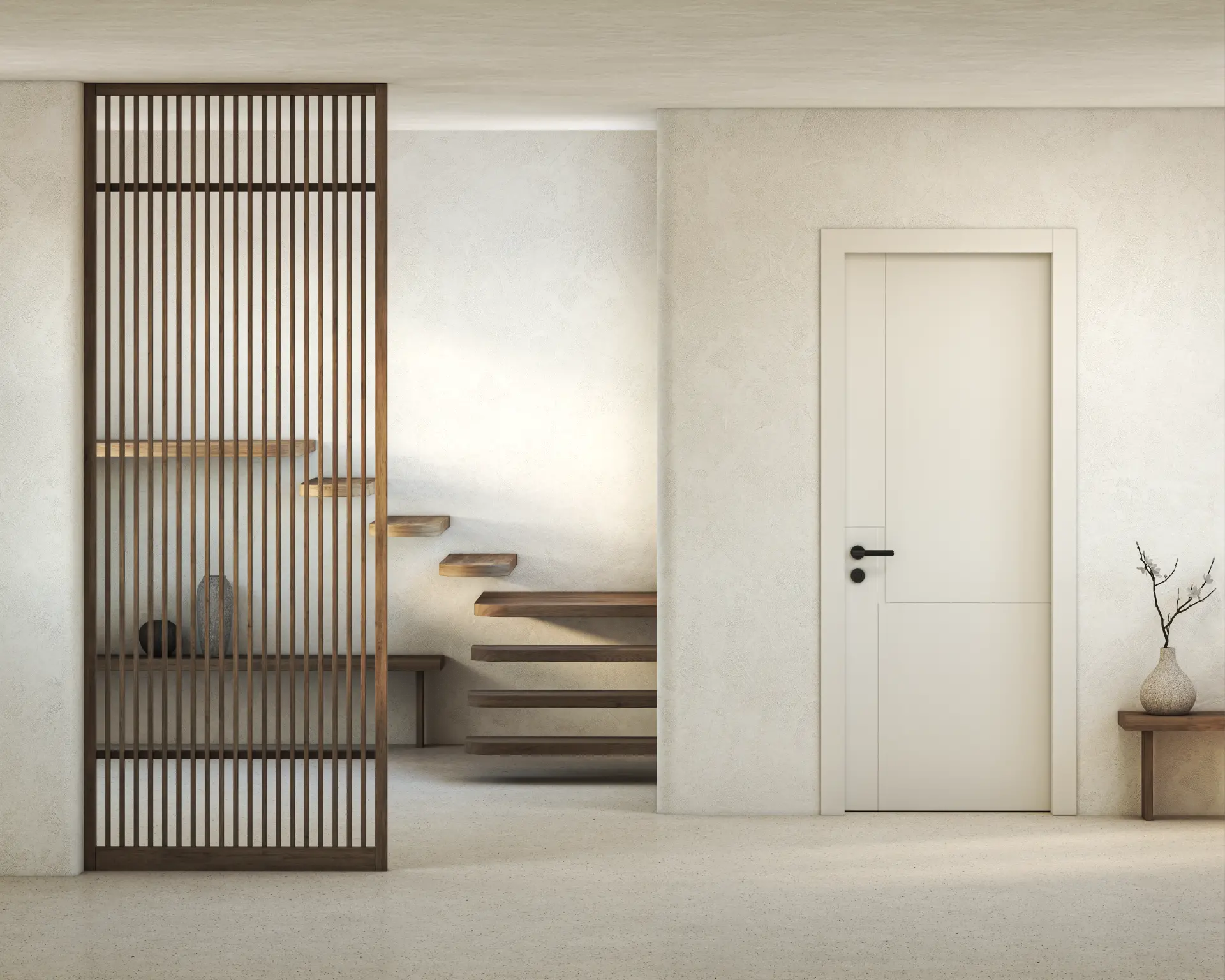 עיצוב א- סימטרי עם נגיעה מודרנית, דלת מעוצבת בקווים ישרים עם חירוץ אנכי מלא בצד שמאל, המשתלב עם חירוץ אופקי ייחודי הממוקם מעט מעל מרכז הדלת, ויוצר חלוקה א-סימטרית מעניינת בין שני לוחות חלקים. השילוב מעניק מראה עדכני ומינימליסטי, עם נוכחות עדינה אך מובחנת.