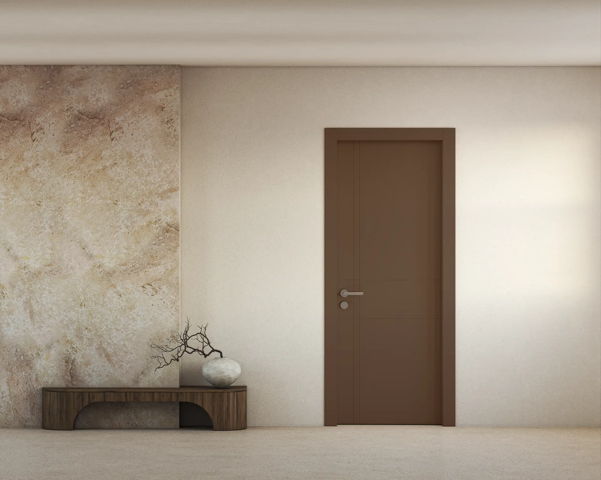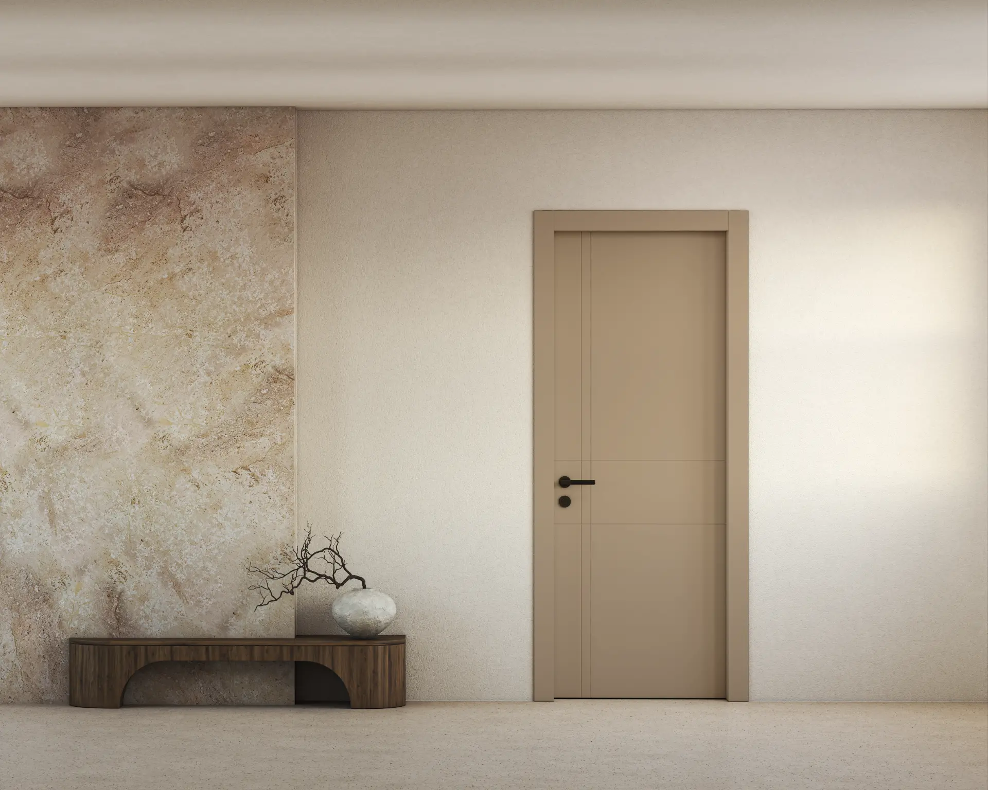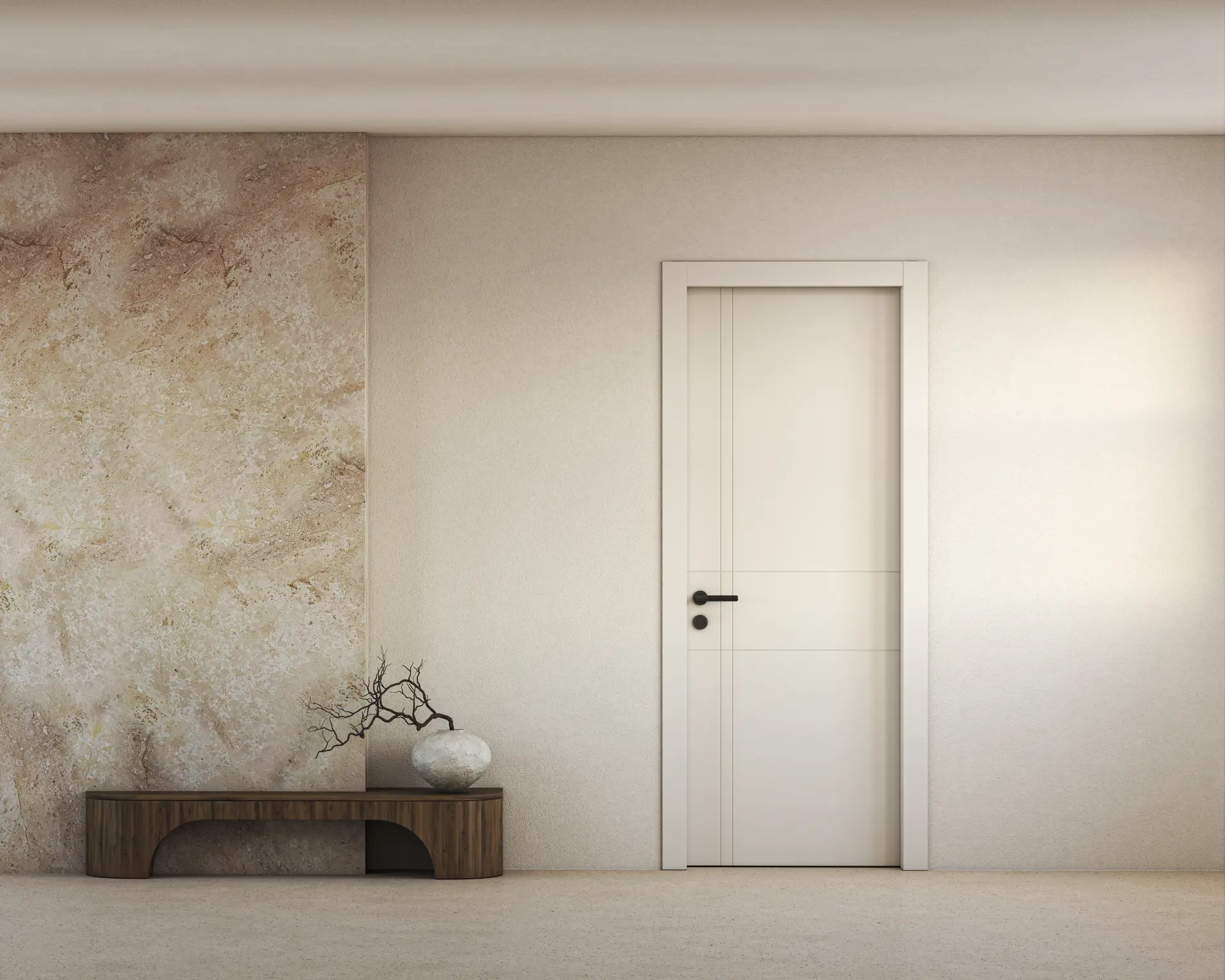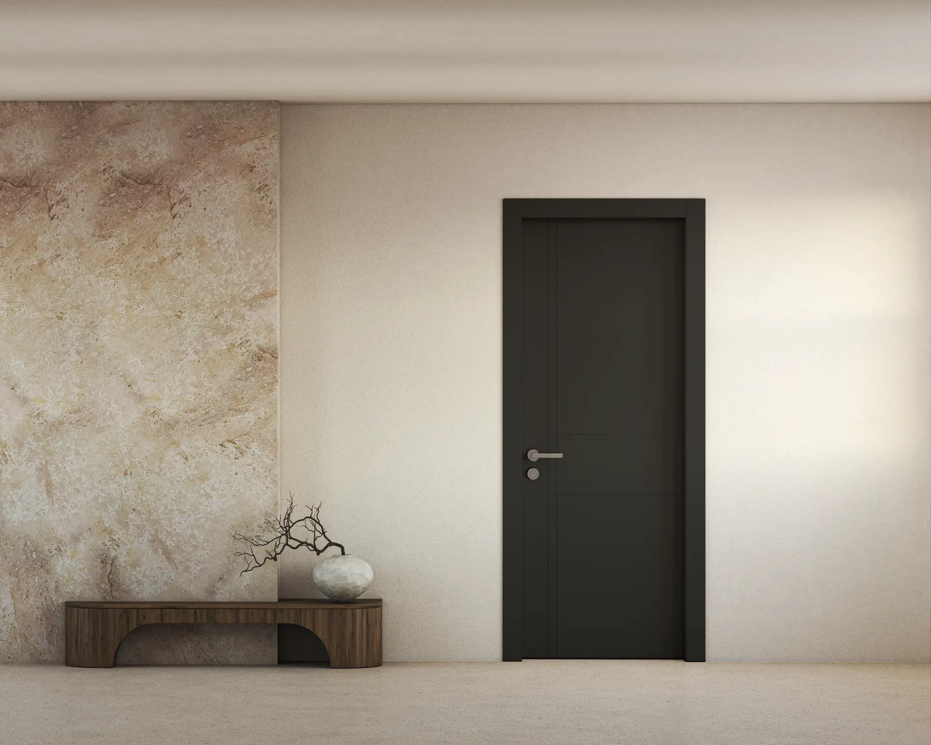 שקיפות וחומר בקווים חדים, דלת מודרנית עם חירוץ אנכי ואופקי. העיצוב הגרפי מעניק לדלת מבנה ברור ואלגנטי, עם תחושה של דיוק אדריכלי מבלי להכביד על החלל. מתאים במיוחד לפרויקטים מודרניים או מינימליסטיים שמבקשים לשלב אלמנט עיצובי ברור במישור חלק.