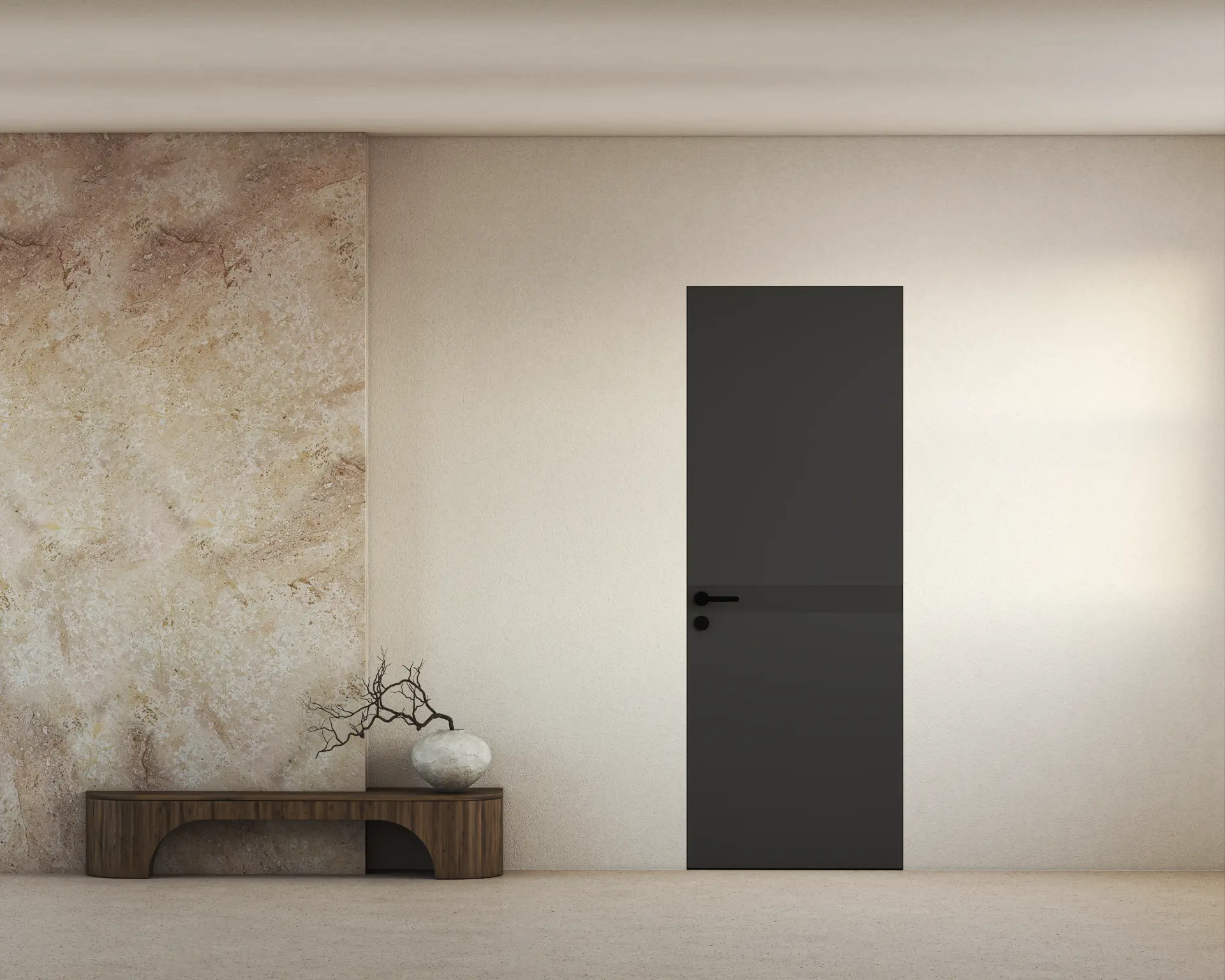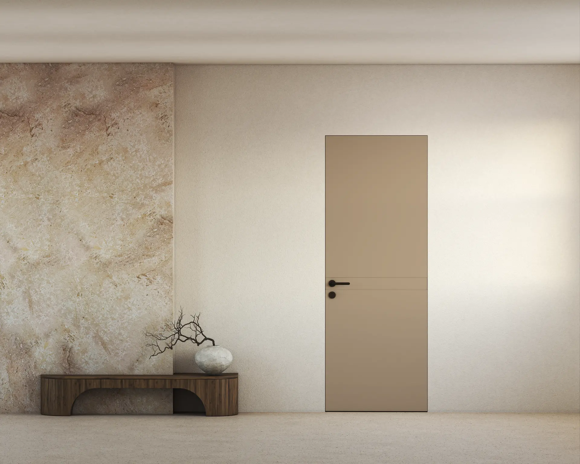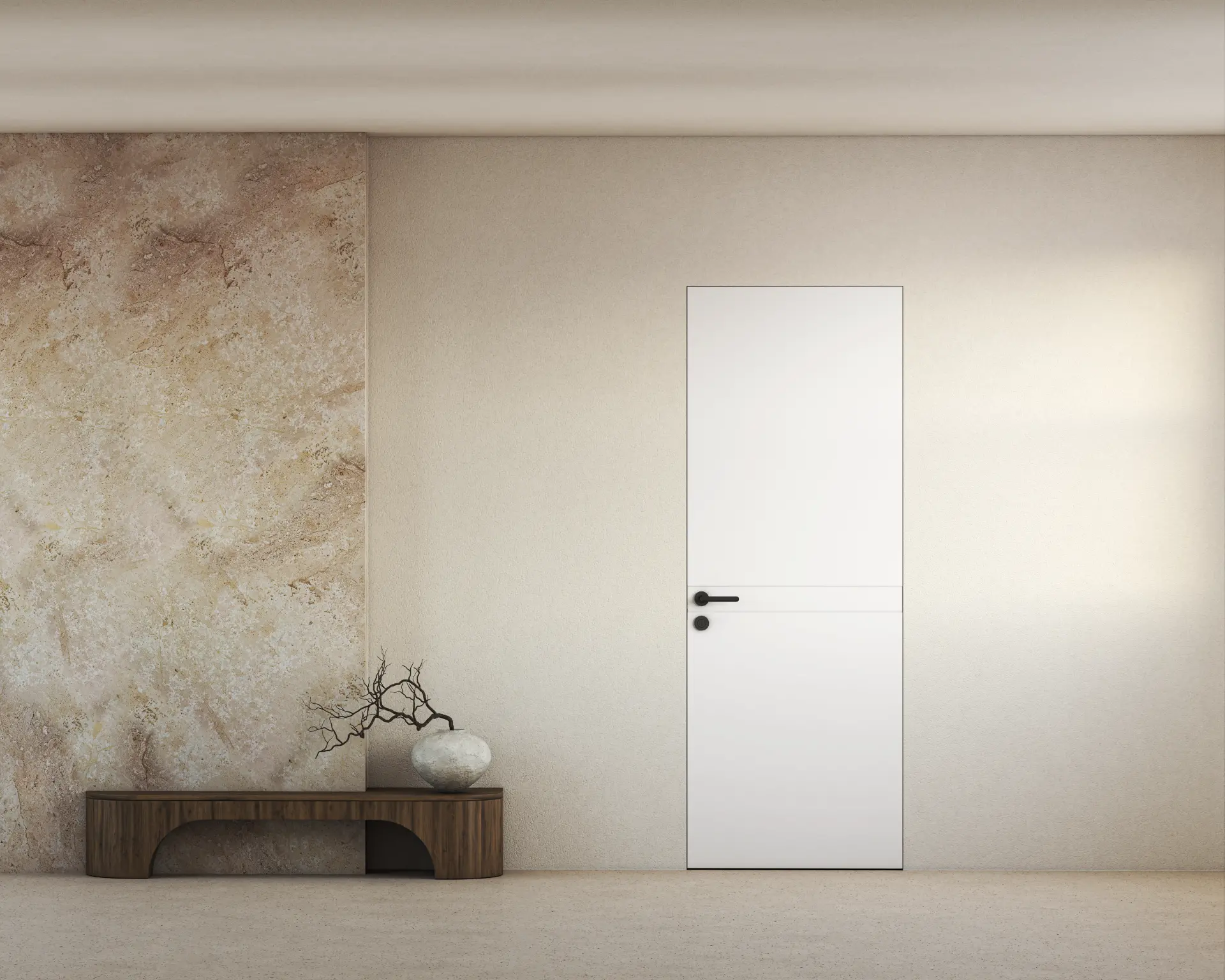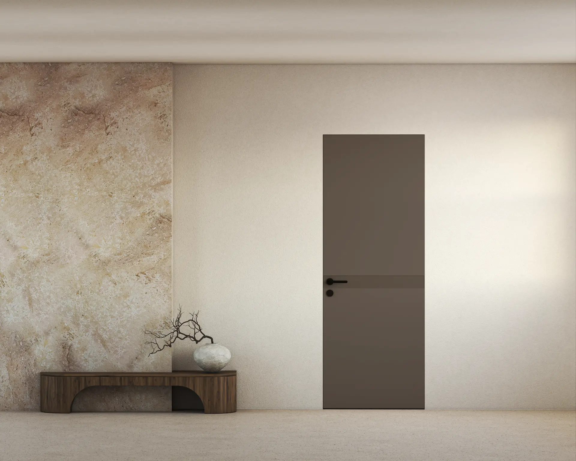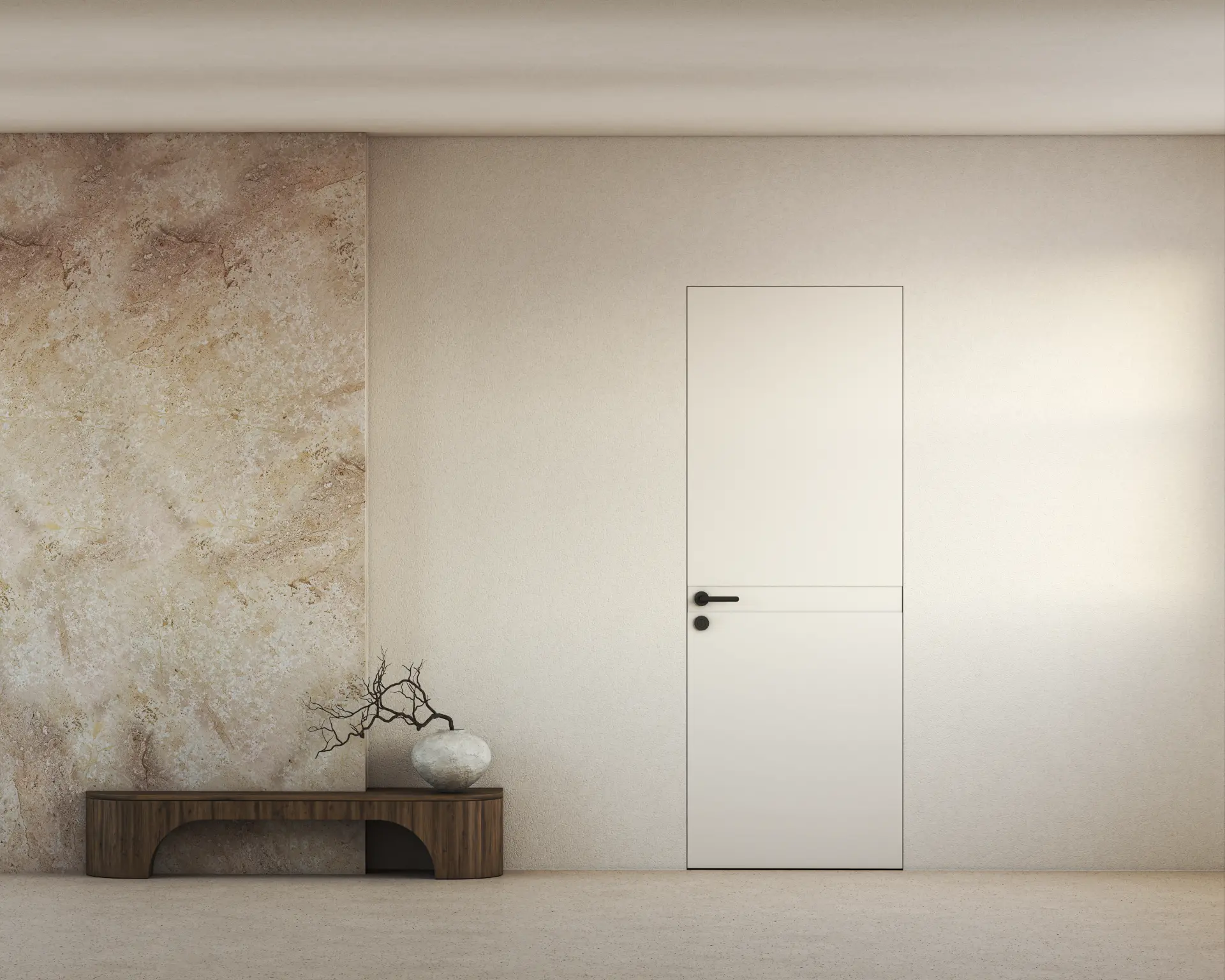 קו אחד ואמירה שלמה- דלת חלקה עם פס אופקי דק בגובה הידית, שמשלב בתוכו גם את מנגנון הפתיחה. למראה מינימליסטי , הרמוני ומדוייק. השפה הגרפית נמשכת בקו נקי לאורך כל המישור ויוצרת תחושת זרימה מתמשכת.