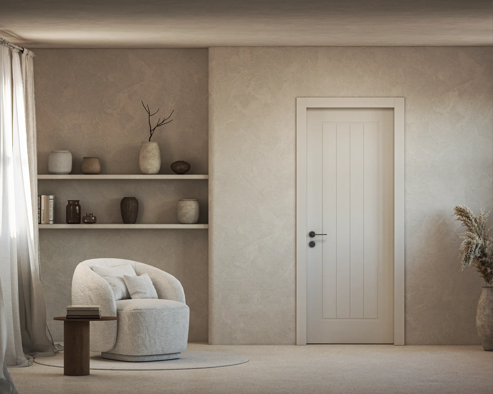 דלת קלאסית עם חירוצים אנכיים במסגרת פנימית, משלבת בין קווים קלאסיים למקצב אנכי עדין. חזית הדלת מעוצבת במסגרת פנימית ברורה שבתוכה סדרת חירוצים אנכיים דקים, היוצרים תחושת גובה, תנועה ואלגנטיות מחויטת.