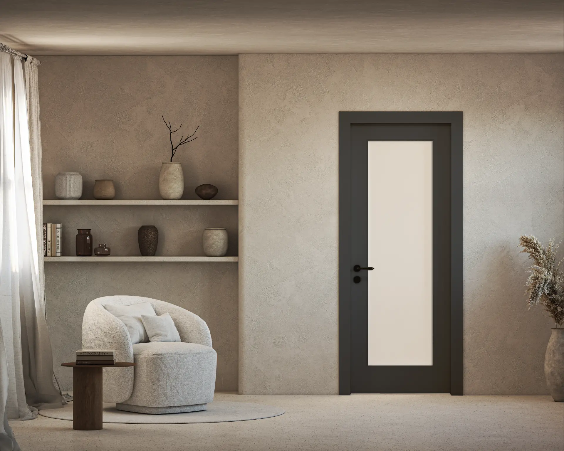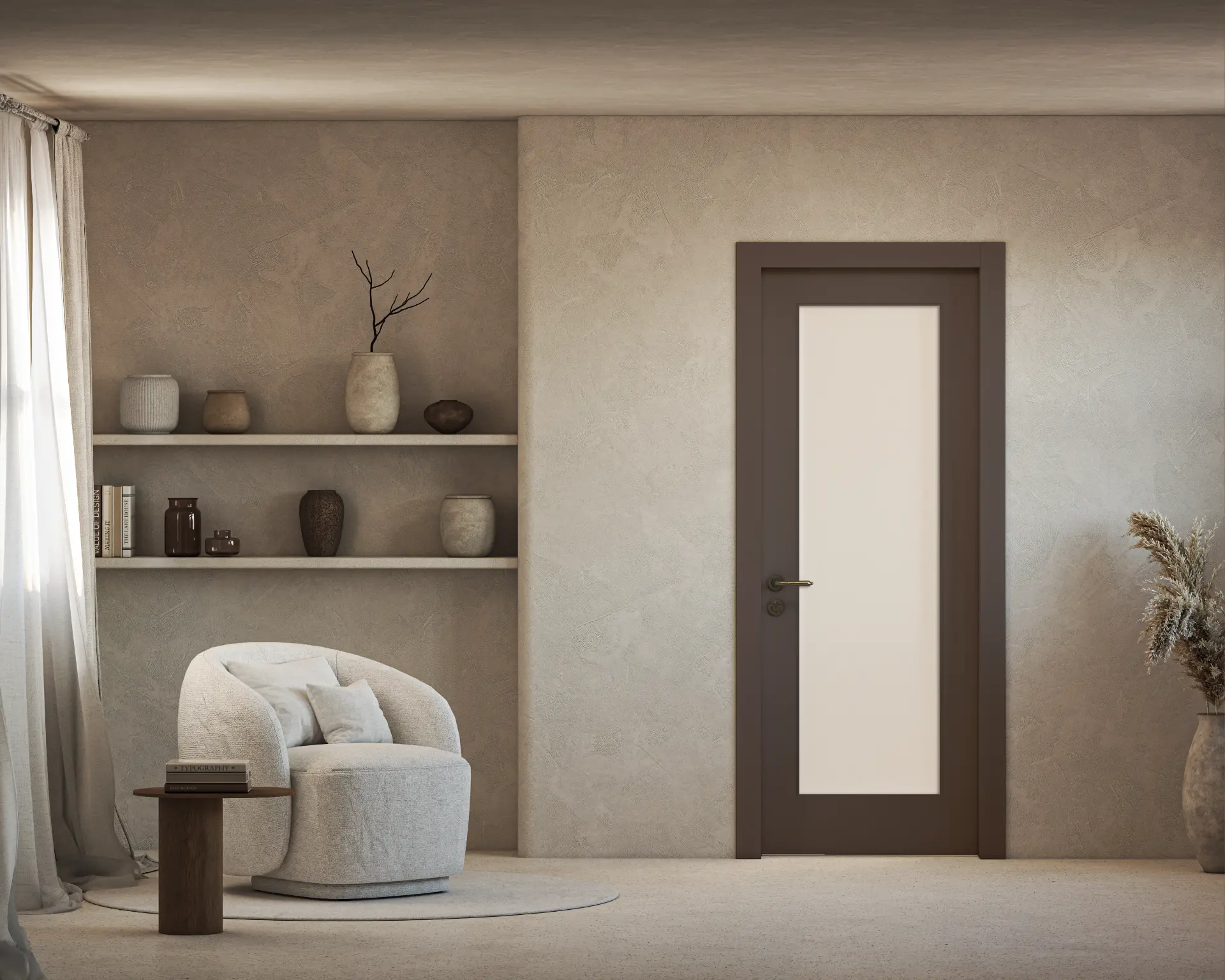 פרטיות רכה במראה כפרי. דלת כפרית עם שילוב של זכוכית חלבית, המכניסה אור מפוזר אך שומרת על אינטימיות. השילוב בין גוון הצבע לבין הזכוכית המטושטשת יוצר מראה עדין, רגוע ונעים לעין – מושלם לחדרי רחצה או חדרי שינה.
